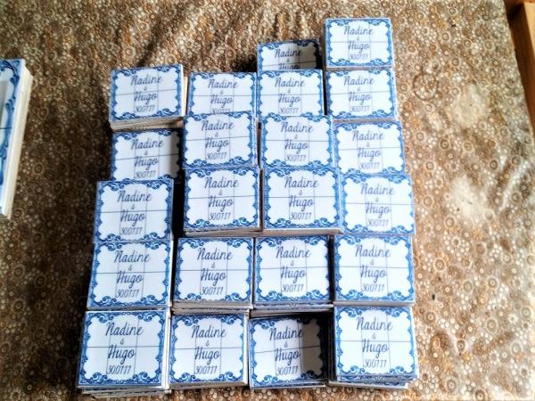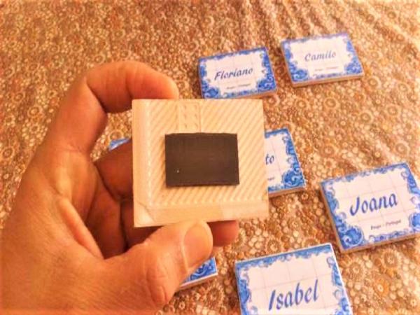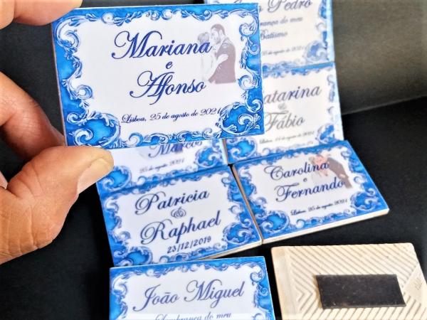 Os nomes dos noivos ou convidados gravados em azulejos magnéticos para prender a qualquer base de metal, frigoríficos, armários…etc. criando assim uma lembrança artística para os seus bons momentos.